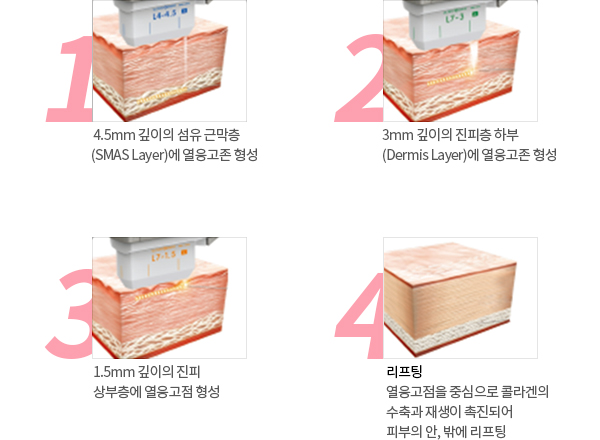 ½´¸µÅ© ÃÊÀ½ÆÄ ¸®ÇÁÆÃÀº °í°µµ Áý¼Ó ÃÊÀ½ÆÄ(High Intensity Focused Ultrasound)¸¦ ÀÌ¿ëÇÑ ºñħ½ÀÀû ¾È¸é°Å»ó¼úÀÔ´Ï´Ù. ÇǺÎÀÇ ÀÏÁ¤ÇÑ ±íÀÌ¿¡ Á¶»çÇϵµ·Ï Ưº°È÷ °í¾ÈµÈ ½´¸µÅ© HIFU ¿¡³ÊÁö´Â ÇǺΠǥ¸é¿¡´Â ÀڱؾøÀÌ ÇÇºÎ¼Ó 3mm(ÁøÇÇÃþ), 4.5mm(¼¶À¯±Ù¸·Ãþ) ±íÀÌ¿¡ ÁýÁßµÇ¾î ¿¬¼ÓÀûÀÎ ¹Ì¼¼ ¿ÀÀ°íÁ¸À» ¸¸µé°í, ÀÀ°íµÈ Á¶Á÷Àº ¼öÃàÇö»óÀÌ µÚµû¶ó¿Í Äݶó°Õ¼¶À¯°¡ Àç»ýµÇ¸é¼ ÇÇºÎ°á °³¼± ¹× ¸®ÇÁÆÃ È¿°ú°¡ ³ªÅ¸³ª°Ô µË´Ï´Ù.